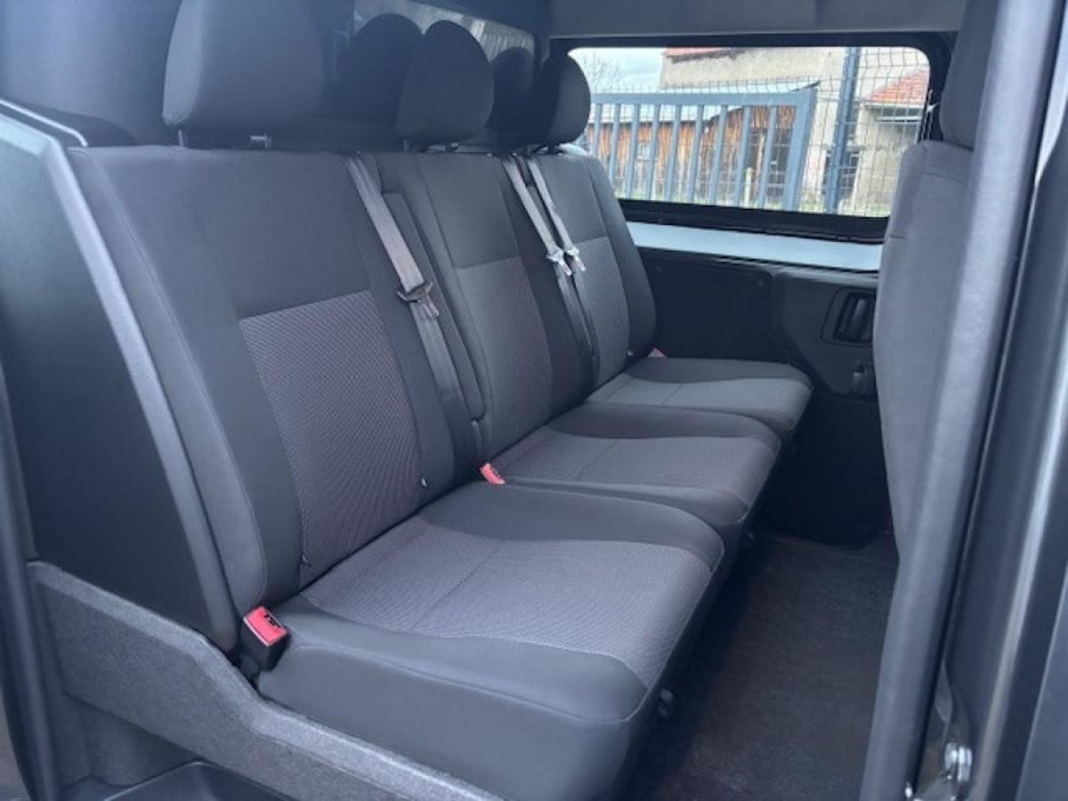 banquette fixe 3 places en rang 2 avec appui-tête réglables et 2 accoudoirs, position unique conforme aux réglementations fiscales pays, avec coffre de rangement amovible sous assises gauche et centrale (accessible depuis habitacle) et avec zone pour char