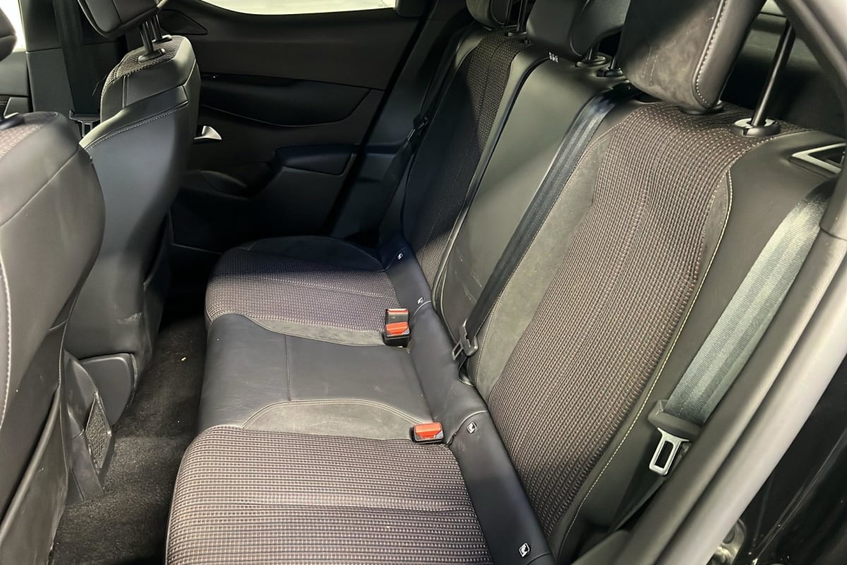intérieur tissu tressé basalte avec alcantara : planche de bord alcantara noir ciel de pavillon gris galet volant cuir fleur perforé et coutures or et carmin décor alcantara noir siège tissu tressé basalte avec alcantara