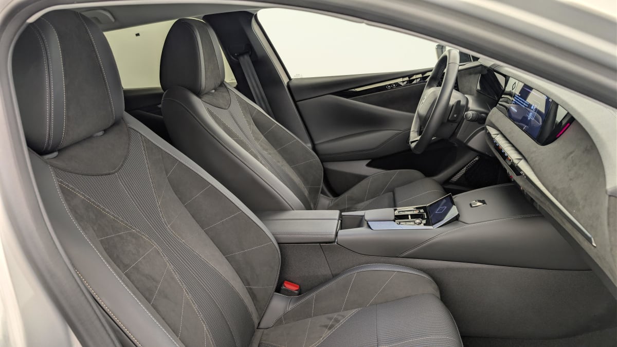 intérieur alcantara noir : planche de bord en alcantara ciel de pavillon clair sellerie en tissu tressé basalte avec alcantara et toile ds décors de panneaux de porte chrome guilloché volant cuir fleur mistral console en toile ds noir basalte panneaux de porte en alcantara et toile ds noir basalte