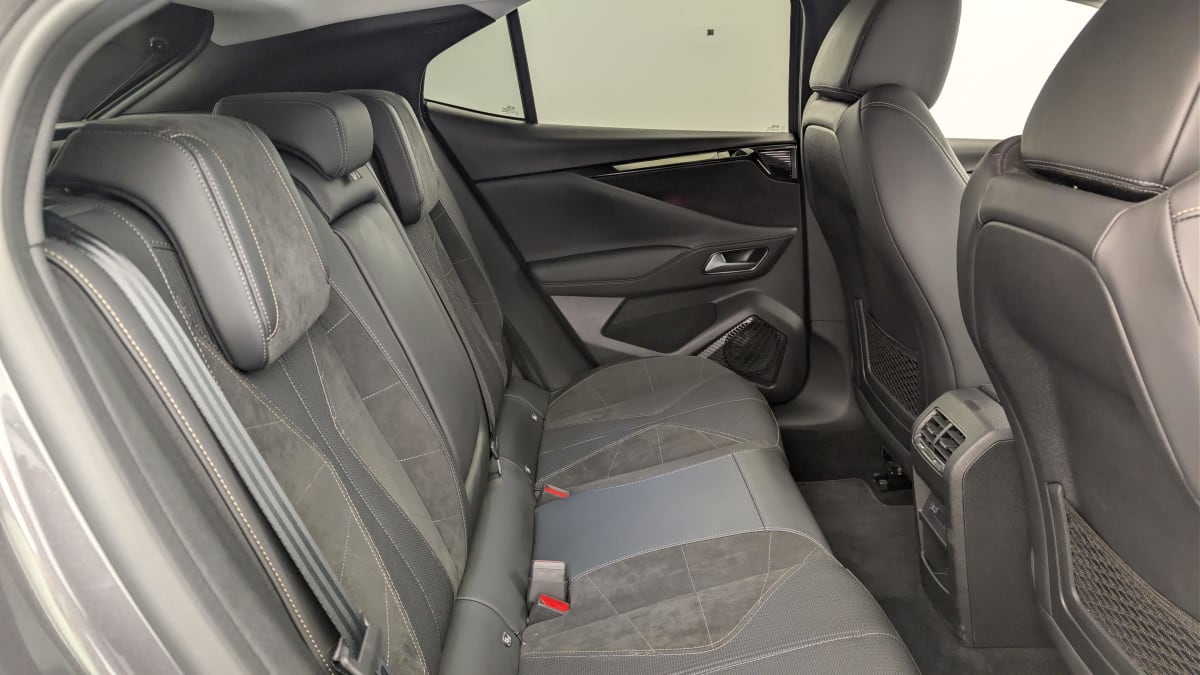 intérieur alcantara noir : planche de bord en alcantara ciel de pavillon clair sellerie en tissu tressé basalte avec alcantara et toile ds décors de panneaux de porte chrome guilloché volant cuir fleur mistral console en toile ds noir basalte panneaux de porte en alcantara et toile ds noir basalte