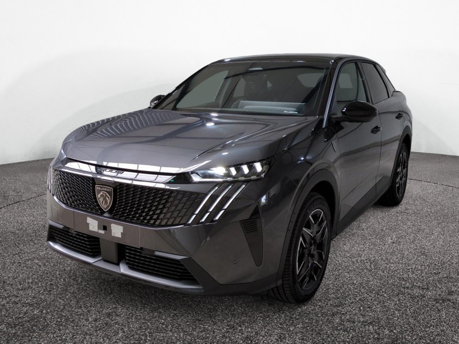 eléments de style éxterieur : bandeau entre les projecteurs noir laqué avec logo 3008. calandre couleur caisse