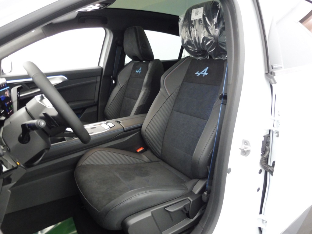 sellerie mixte alcantara avec surpiqûres bleues et logo alpine lumineux